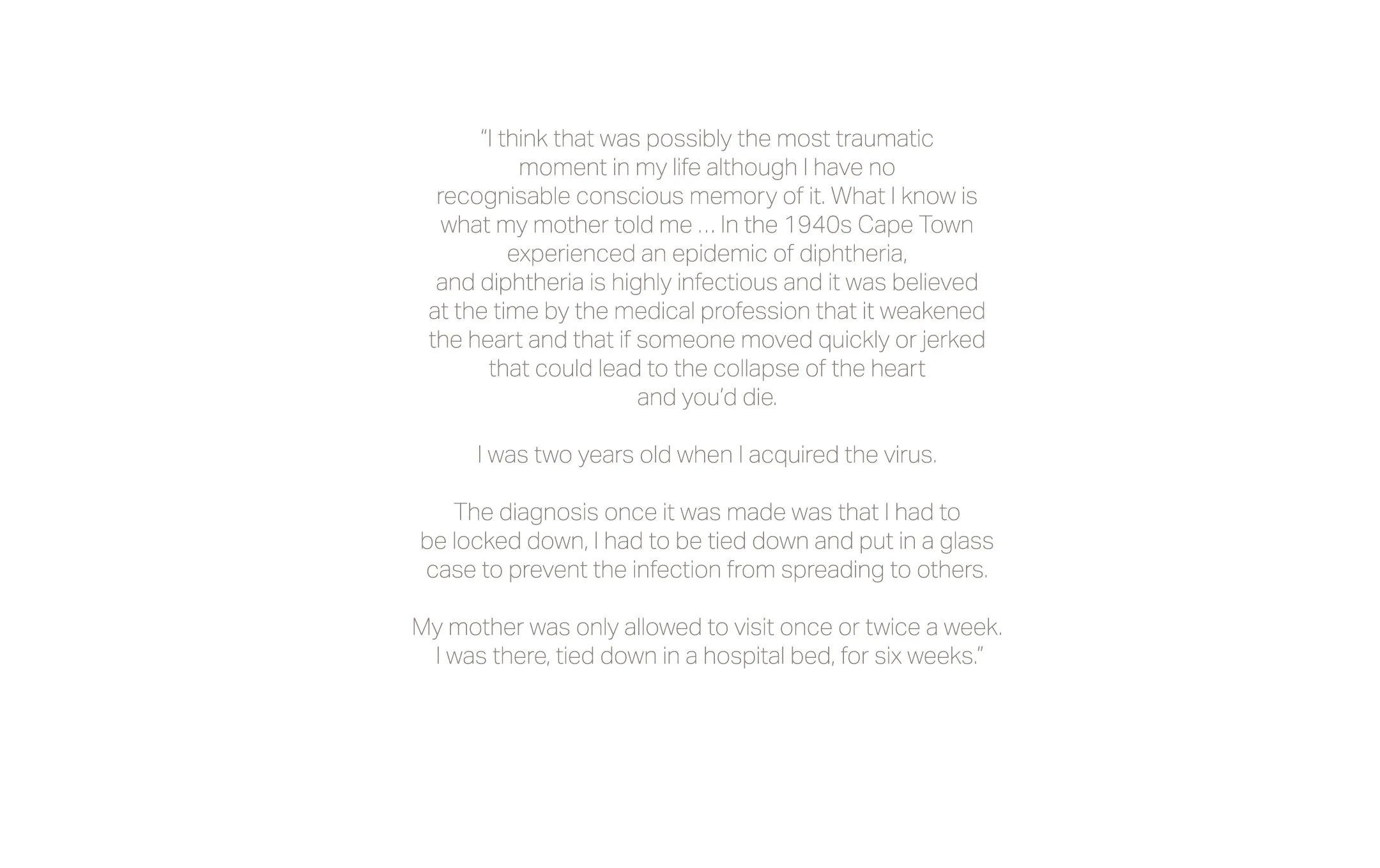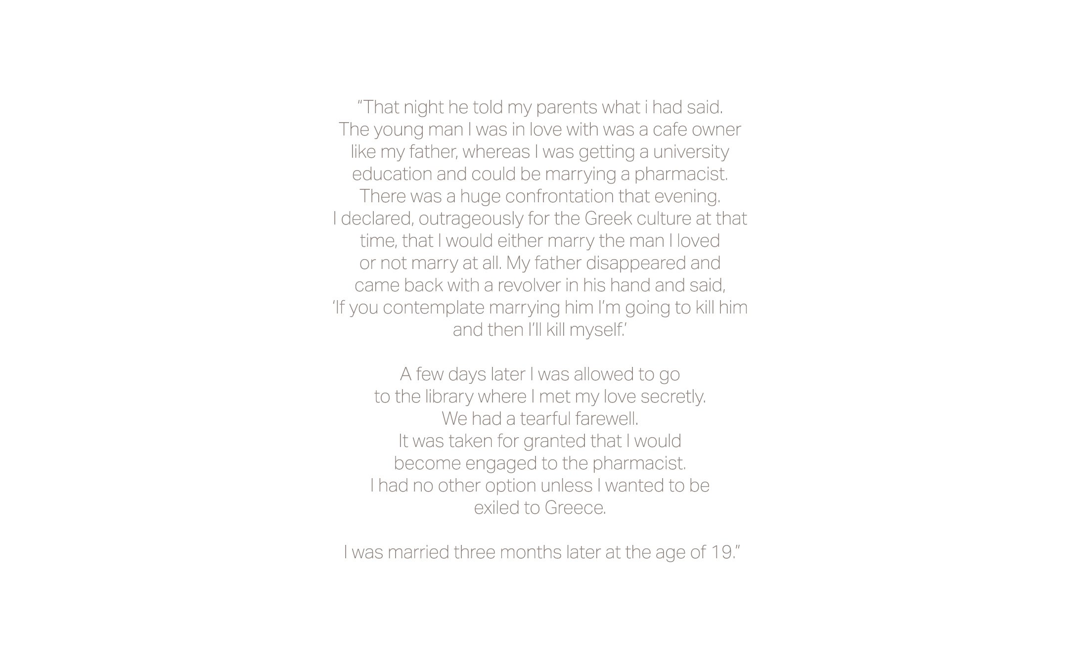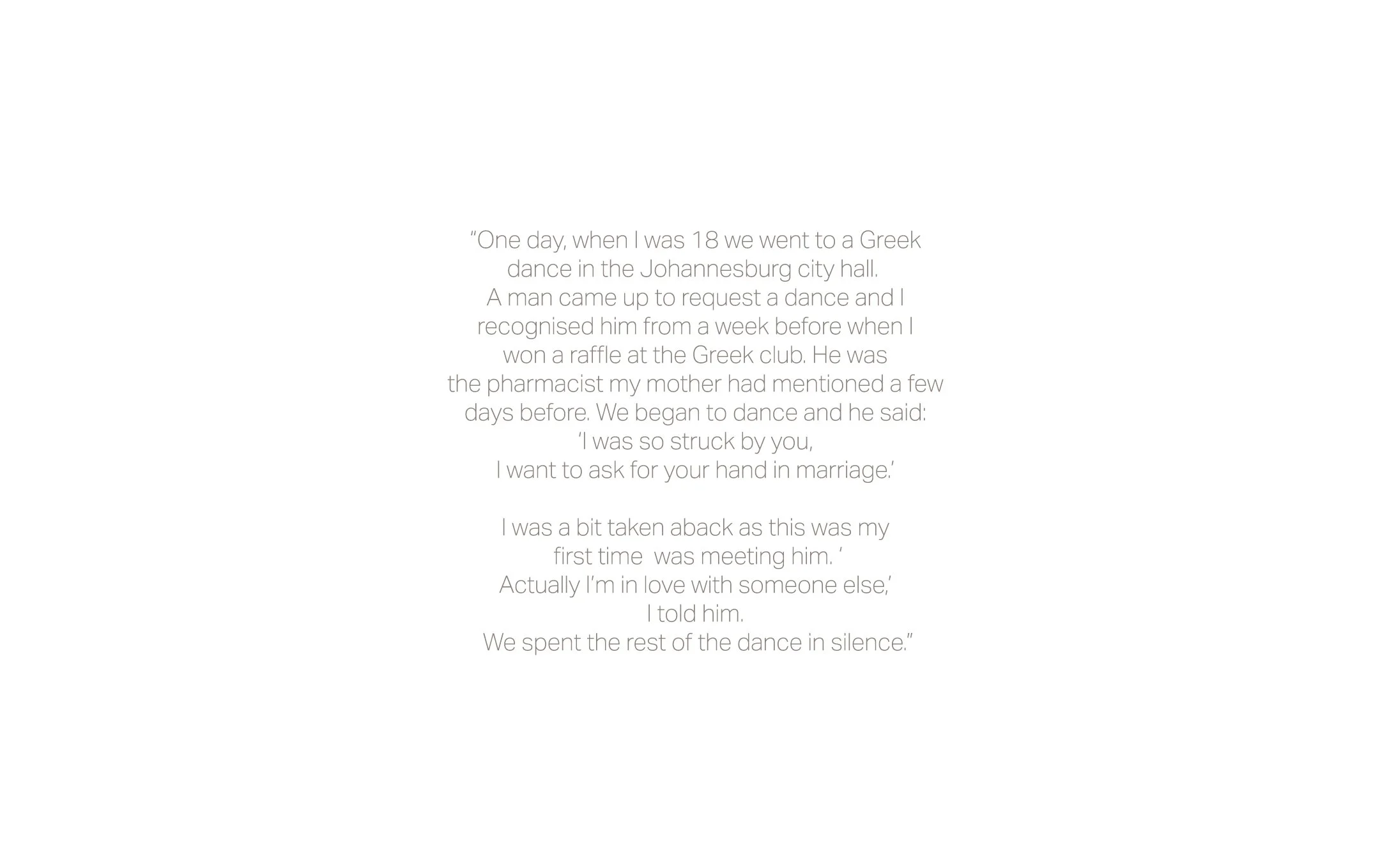 They were recent economic migrants to South Africa from a small village on a little island in Greece. I would stare for hours at the photograph, my grandparents looking young and glamorous, dressed in their finest; at my 3-year-old mother, sitting obediently with curls in her hair; at the studio painted backdrop of a misty romantic scene. Though they had just left their whole world behind in search of a better life, to me they looked like elegant characters from a tale my grandmother would tell. This family photograph, of all the images I have, is my most treasured.